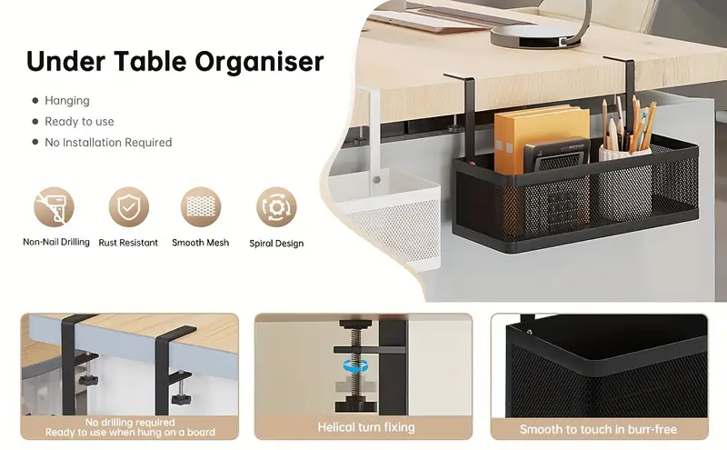 The innovative design of our cable management rack allows you to hang it directly under your desk frame without the need for drilling holes. Simply tighten the black knob upwards by hand. This user-friendly mechanism not only makes installation a breeze but also enables you to adjust its position effortlessly, providing the flexibility you need in your workspace.