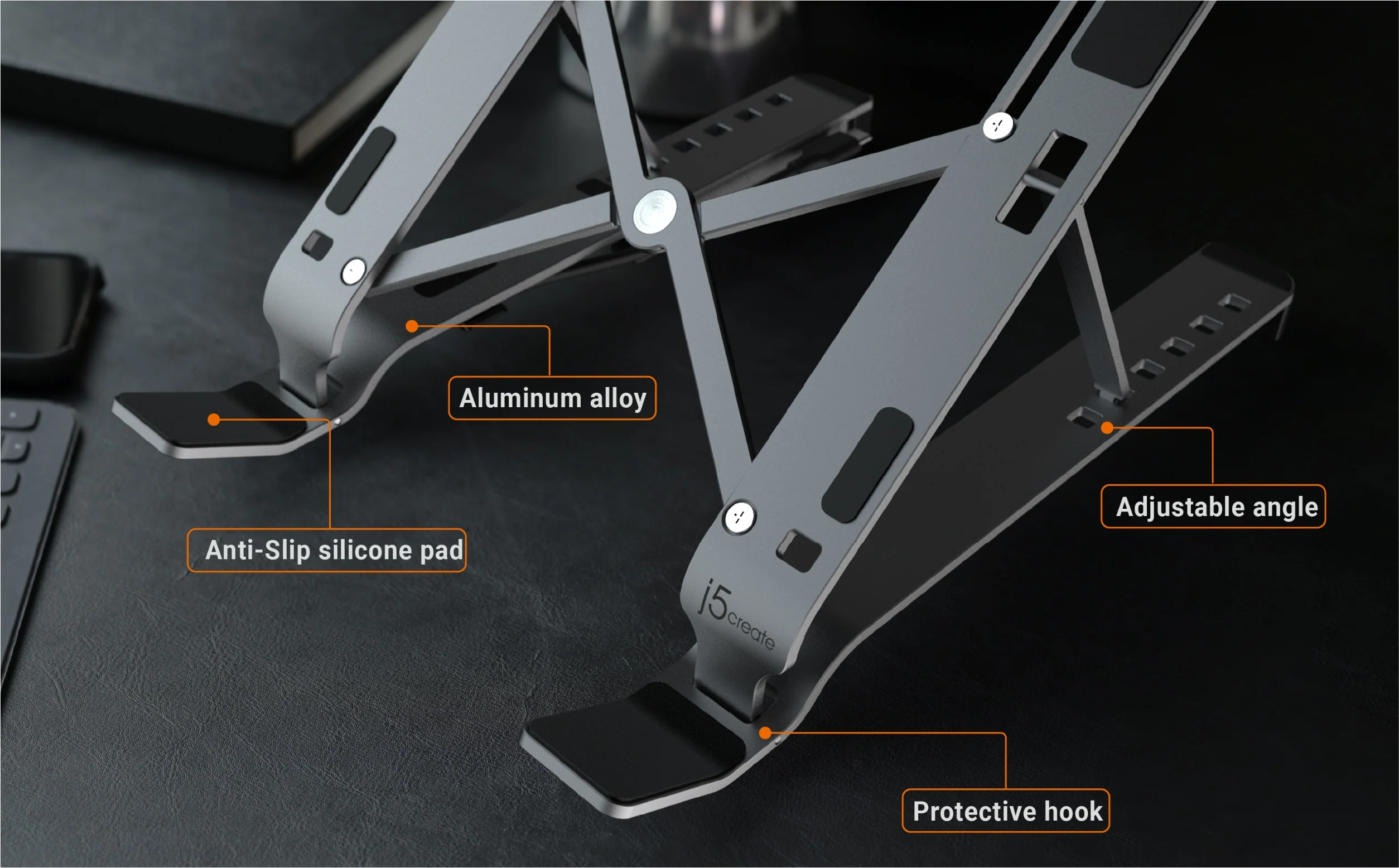 This USB laptop stand is equipped with nonslip protective pads to minimize slipping and prevent any scratches on your devices, giving you peace of mind while you work. If you’re looking for a practical, durable, and stylish solution to optimize your workspace, look no further than the j5create JTS223 USB HUB X-Kit Laptop Stand.