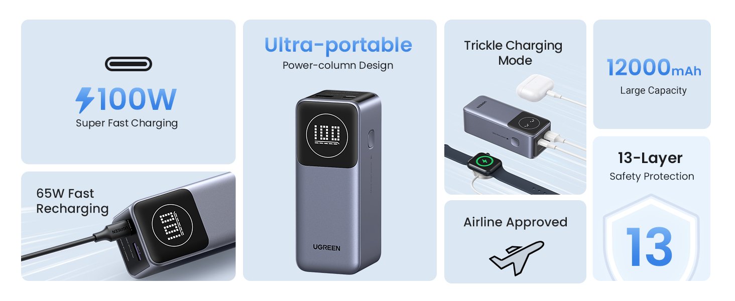 Unlock the ultimate convenience with the UGREEN Nexode Power Bank 12000mAh 100W. This high-capacity power bank is engineered to provide ultra-fast charging for your devices. Imagine being able to power your iPad Pro to 40% in just 30 minutes! With its impressive 100W output, you can rapidly charge multiple devices simultaneously, ensuring that you stay connected, productive, and entertained wherever you go.